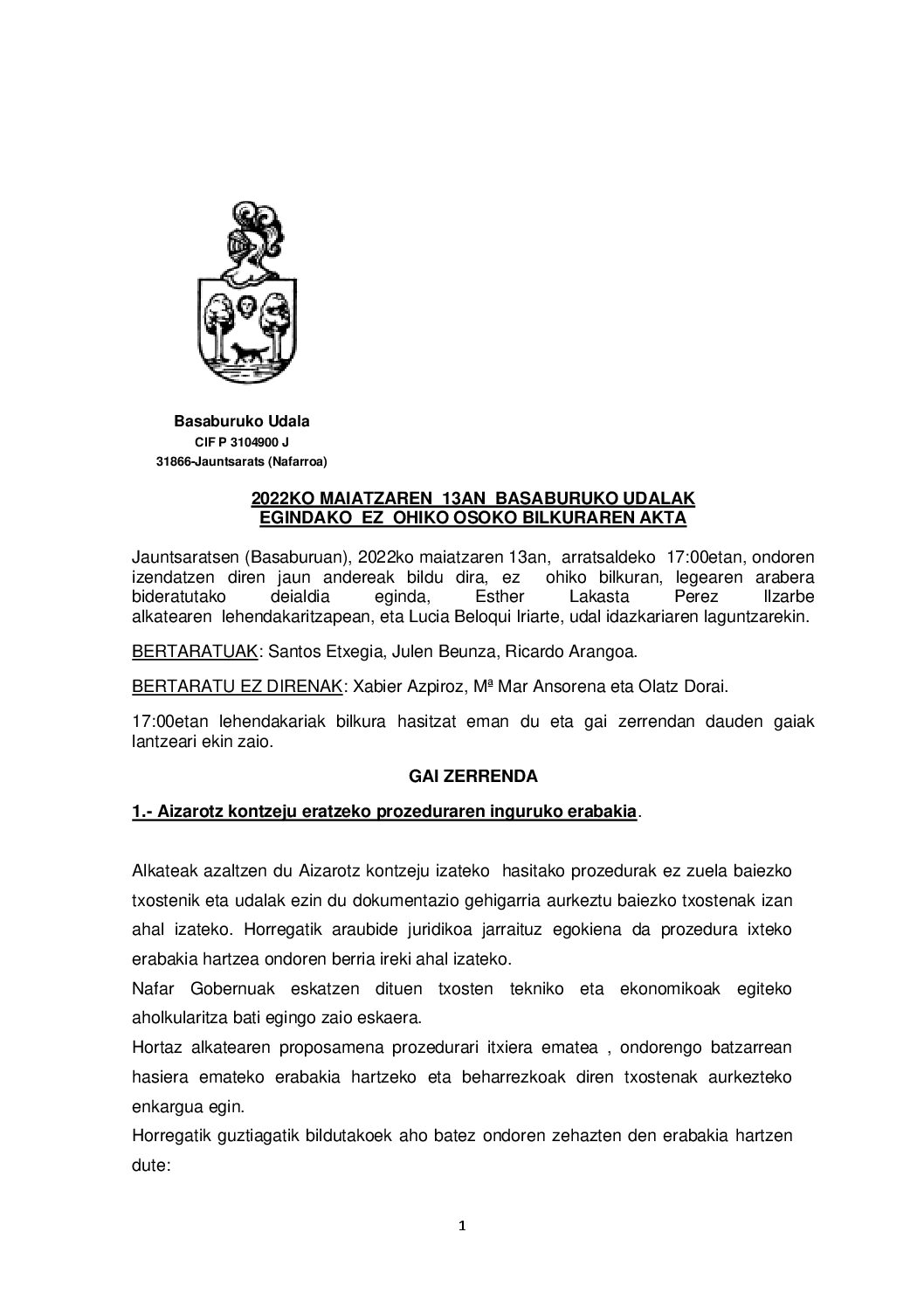 2022-05-13 Ez-ohiko udal batzarreko Akta