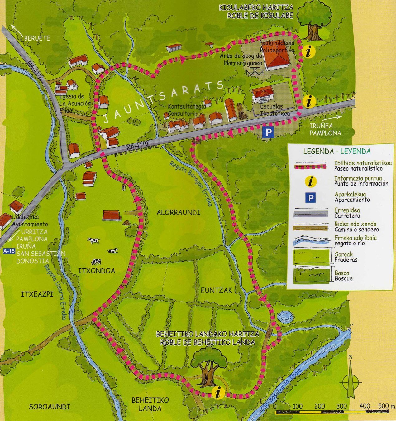 Partiremos del aparcamiento ubicado junto a la escuela y al polideportivo de Jauntsara, y recorreremos un sendero de 1.800 metros. Seguiremos el camino adaptado y, tras realizar el recorrido circular, regresaremos al punto de inicio.